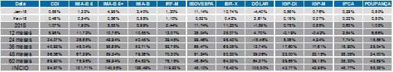 O ano de 2018 se inicia com resultados muito próximos do que vimos ao longo dos dois últimos anos, com bons ganhos. No mês de janeiro, o mercado externo permaneceu otimista com as expectativas de crescimento, o que impulsionou a valorização dos ativos de risco em geral como as commodities e as ações, com destaque para as ações dos países em desenvolvimento que alcançaram maior nível de valorização em 10 anos. No mercado interno, observamos a continuidade do movimento de recuo das taxas de juros, alcançando patamares ainda mais baixos. Em fevereiro, as taxas de juros nominais continuaram recuando, alcançado patamares mais baixos que os de setembro do ano passado. Com relação aos ativos de risco, o mês foi marcado pela volatilidade dos índices em geral, o que pode ser considerado natural, após seguidos meses de recordes de pontuação.